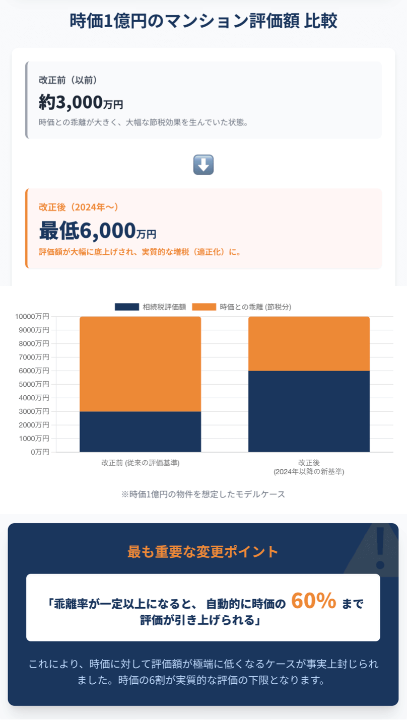 かつては「タワマン節税」として有効だった手法ですが、2024年の改正により、時価と評価額の乖離を利用した大幅な圧縮は困難になりました。