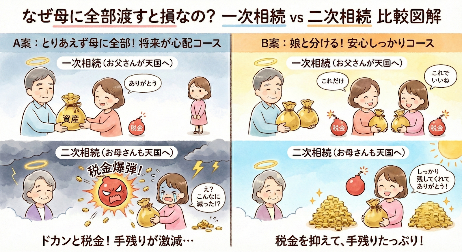 資産家の場合、今回の相続(一次相続:父死亡)だけでなく、将来の相続(二次相続:母死亡)まで計算しないと、トータルで大損をします。